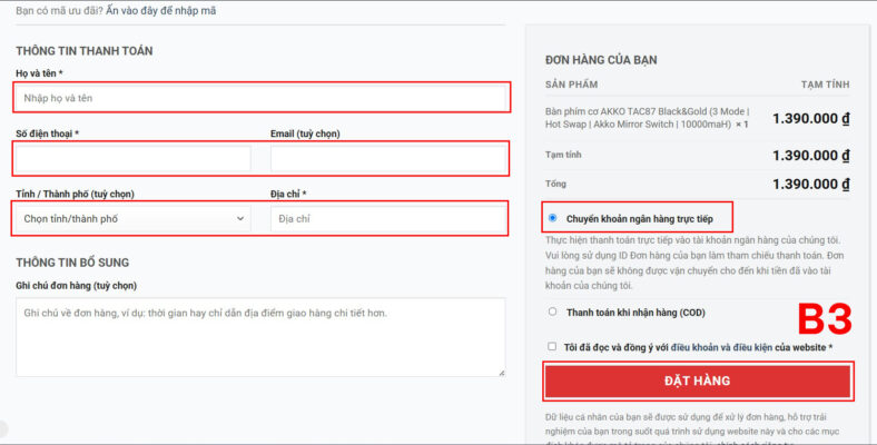 - Bước 3: Điền đầy đủ thông tin & phương thức thanh toán (bắt buộc) -> Bấm vào Nút Đặt Hàng